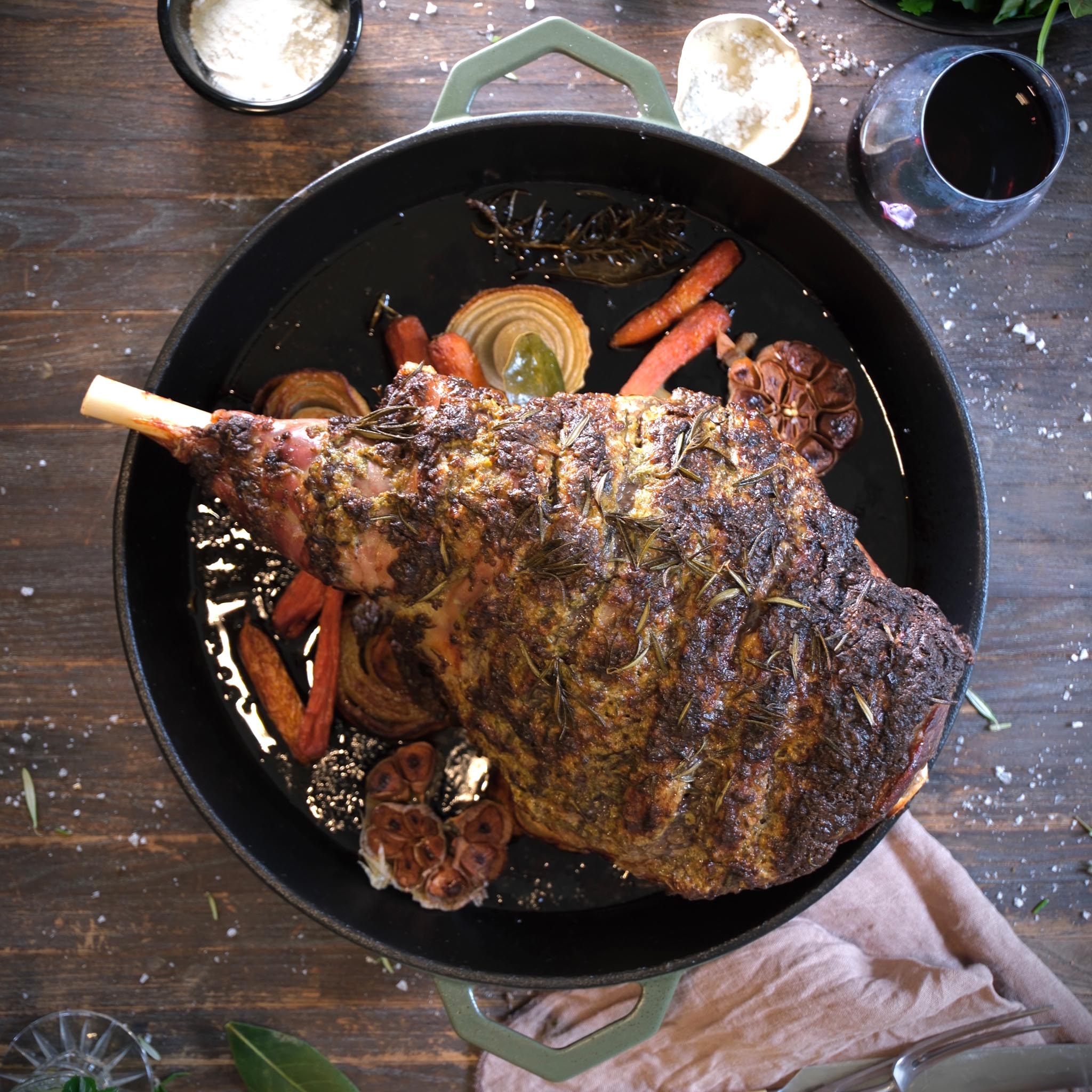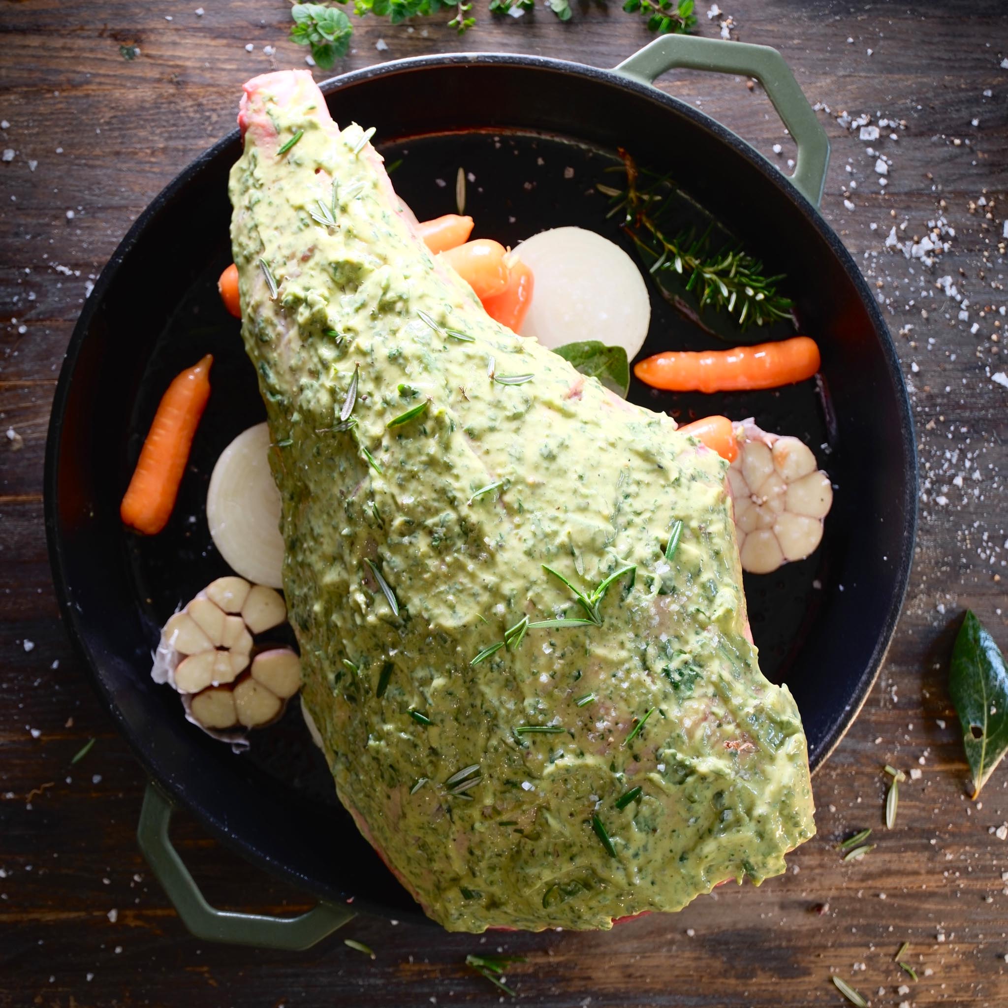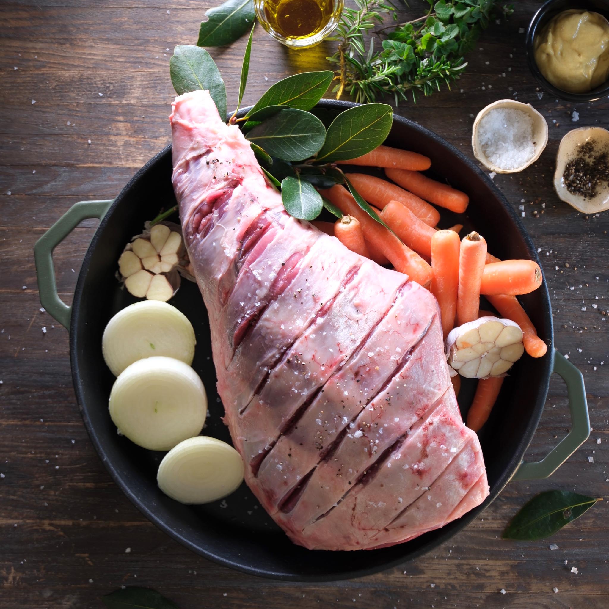 In the bottom of your Ironclad Grande make a bed of the onions, carrots, bay leaves and garlic. Season with salt and pepper and a light spray of olive oil, then nestle the lamb leg on top.