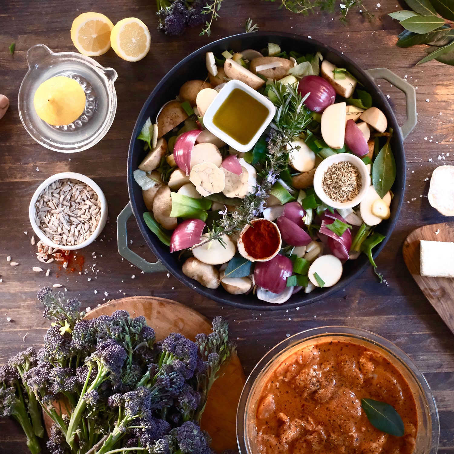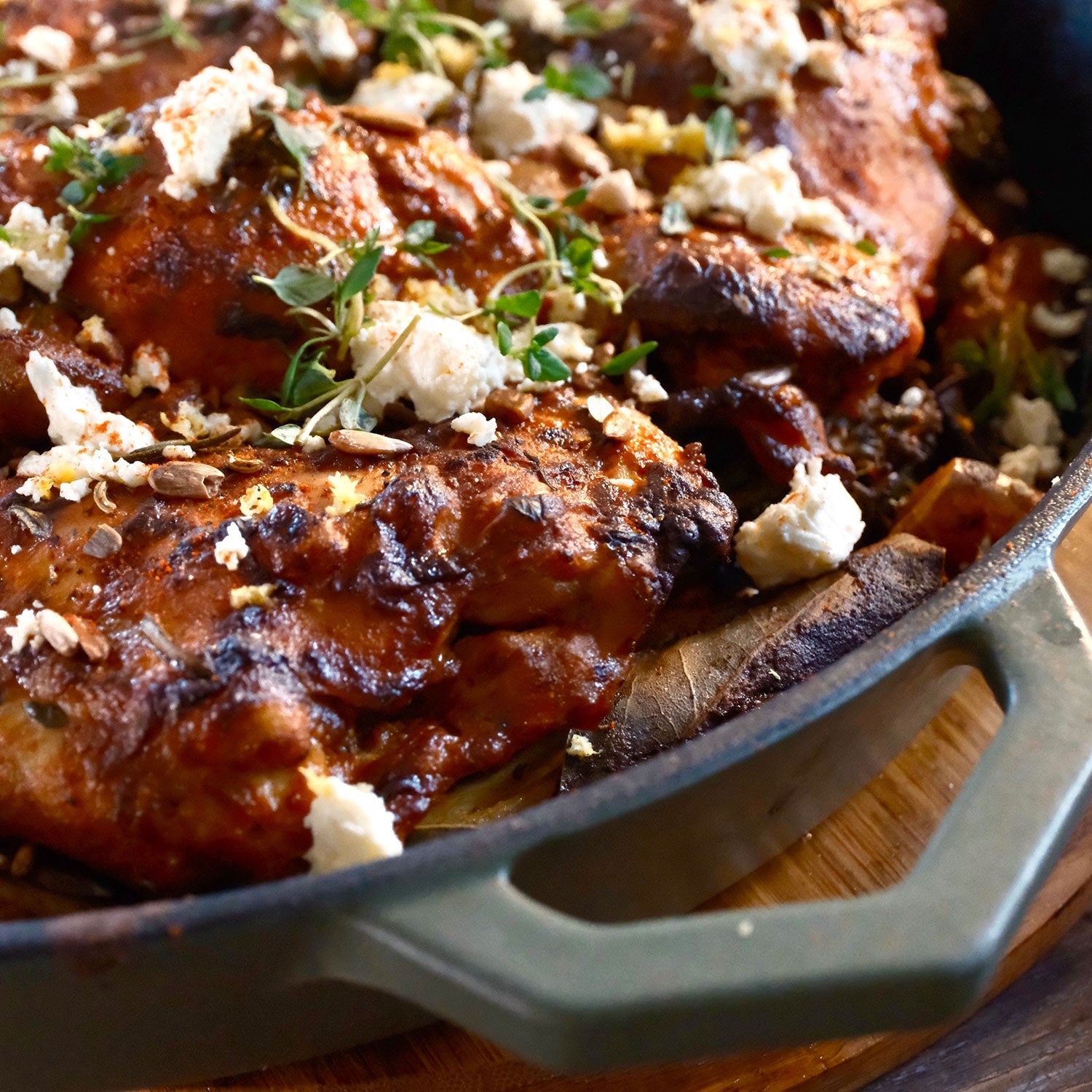 Gather the troops. Serve sizzling to the table and finish off with a crumble of feta, a scatter of sunflower seeds, a squeeze of lemon juice and an extra sprinkle of paprika and fresh thyme.