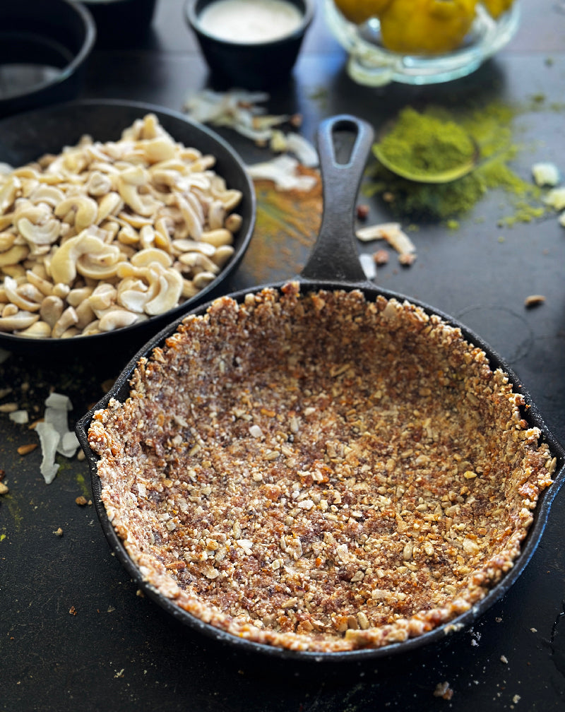 To start, pulse the apricots in your high speed blender until roughly chopped, then add the rest of the ingredients and pulse lightly. Don’t over blend as the crust should be textured and you should be able to squeeze the mixture between your fingers and it stick together.