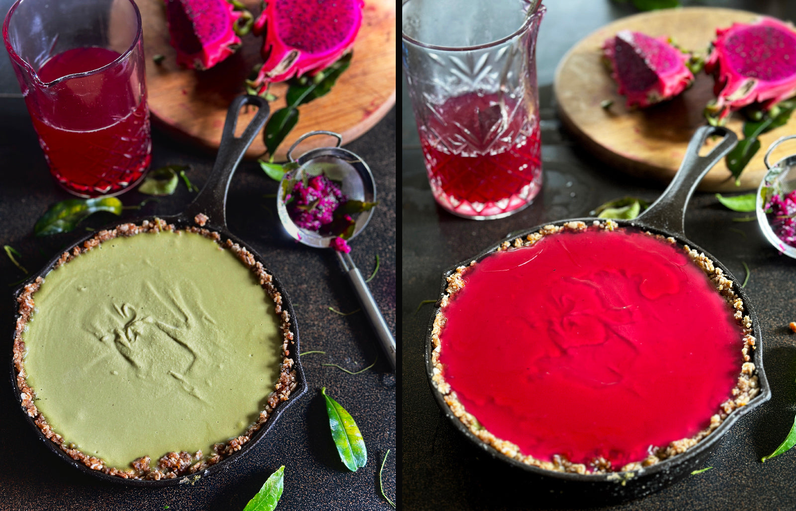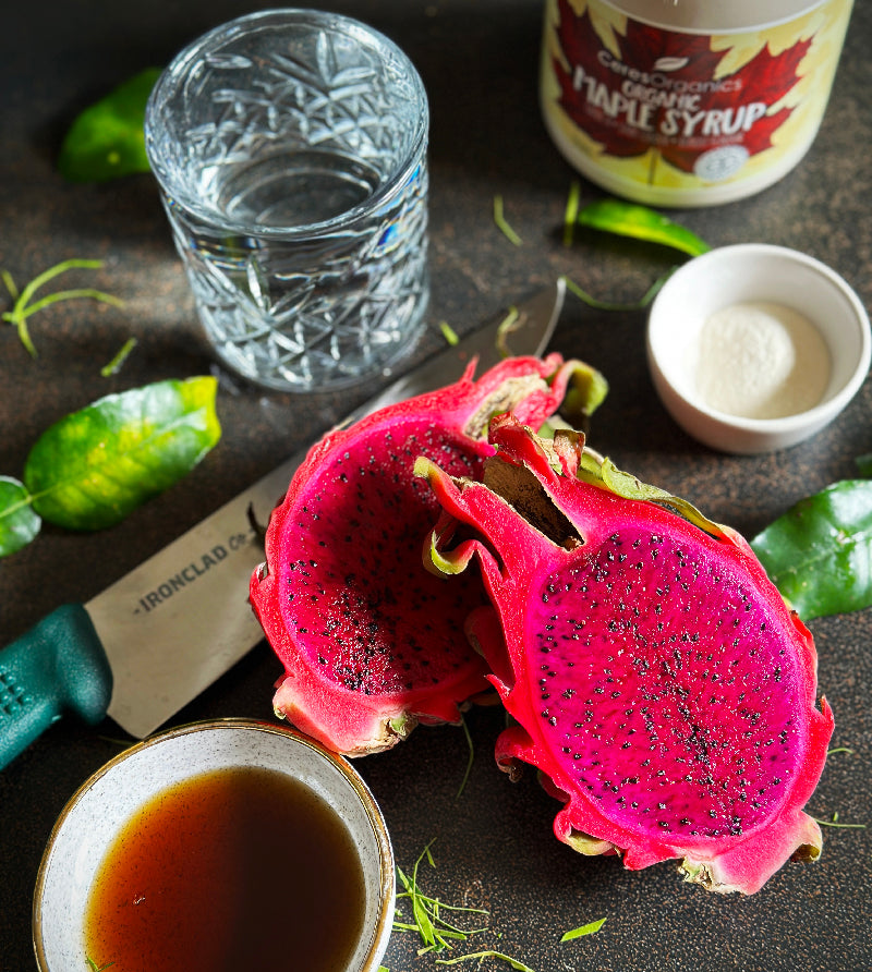 To make the jelly: In a small pot, bring 1 cup of water, the lime juice, maple syrup, mashed dragon fruit and lime leaves to a boil. Simmer for 1 minute then leave to cool in the pot. Once cool strain the mix and return the liquid to the pot.