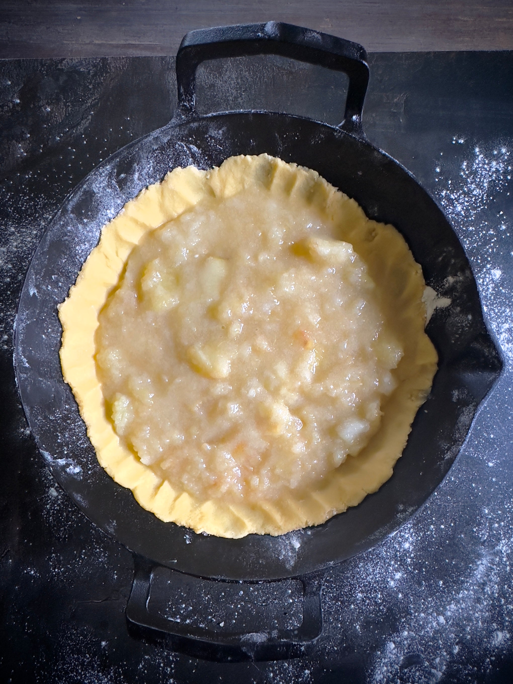 Fill with the cool stewed apples, making sure you leave a rim of pastry above the fruit.