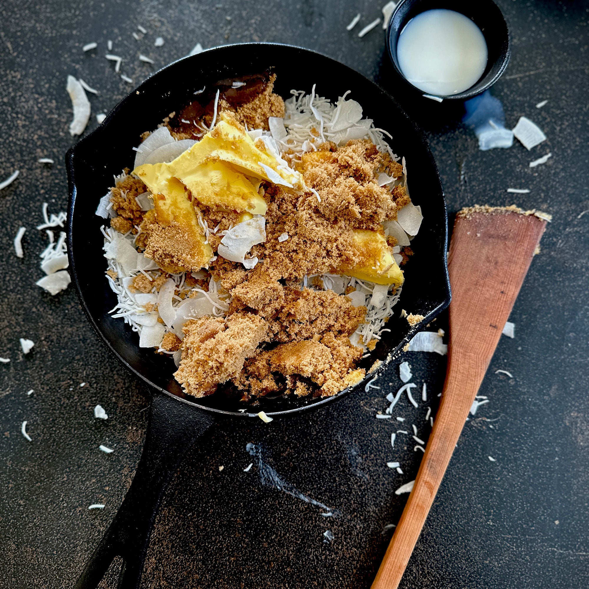 Bake for 35 minutes, the sponge will be nearly but not quite cooked. Two minutes before you remove the pudding from the oven, place all the coconut topping ingredients in your Lil’ Legacy Pan and bring to a simmer while stirring constantly. Remove from heat when melted (it will continue cooking in the hot pan).