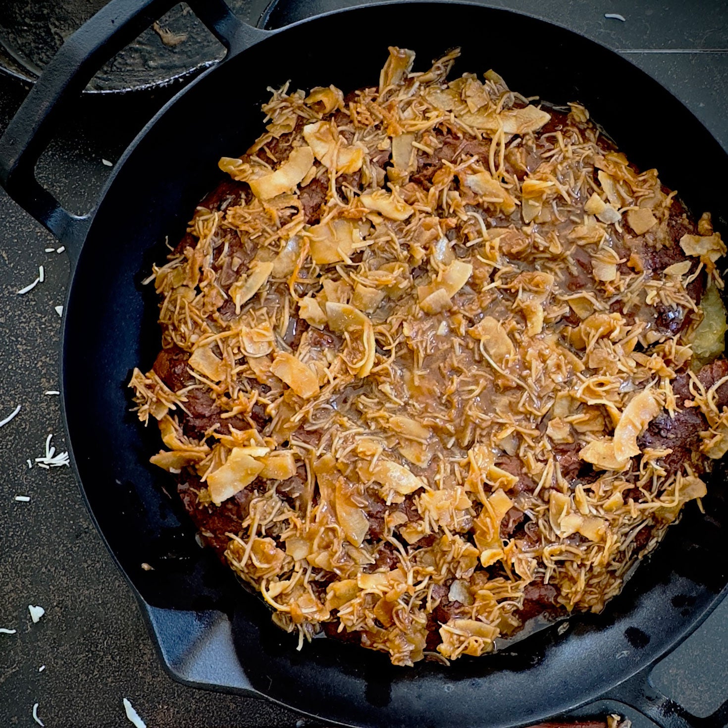 Remove the Wok from the oven and swiftly spoon the caramelised coconut evenly over the top of the sponge. Use a knife to even it all out then return to oven and bake a further 10 – 12 minutes till the topping is brown and crunchy and a skewer inserted into the pudding comes out clean.